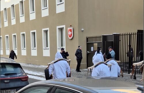 Am 26. Januar bot sich für die Reisegruppe aus der Schweiz die Gelegenheit, den Botschafter der Schweizerischen Eidgenossenschaft in Moskau, Jürg Burri, persönlich zu begrüssen. Wie 31 andere neu ernannte Botschafter hatte er am 15. Januar 2026 dem russischen Präsidenten Vladimir Putin sein Beglaubigungsschreiben überreicht. Auch vor dem Treffen mit Herrn Burri kamen die Trycheln zum Einsatz: Starke Frauen und Männer trugen sie in der klirrenden Kälte von der Metro-Station Chistye Prudy durch die Strassen zur Schweizer Botschaft an der Per. Ogorodnaya Sloboda. Erstaunte und auch erfreute Moskauer Passanten konnten beobachtet werden.