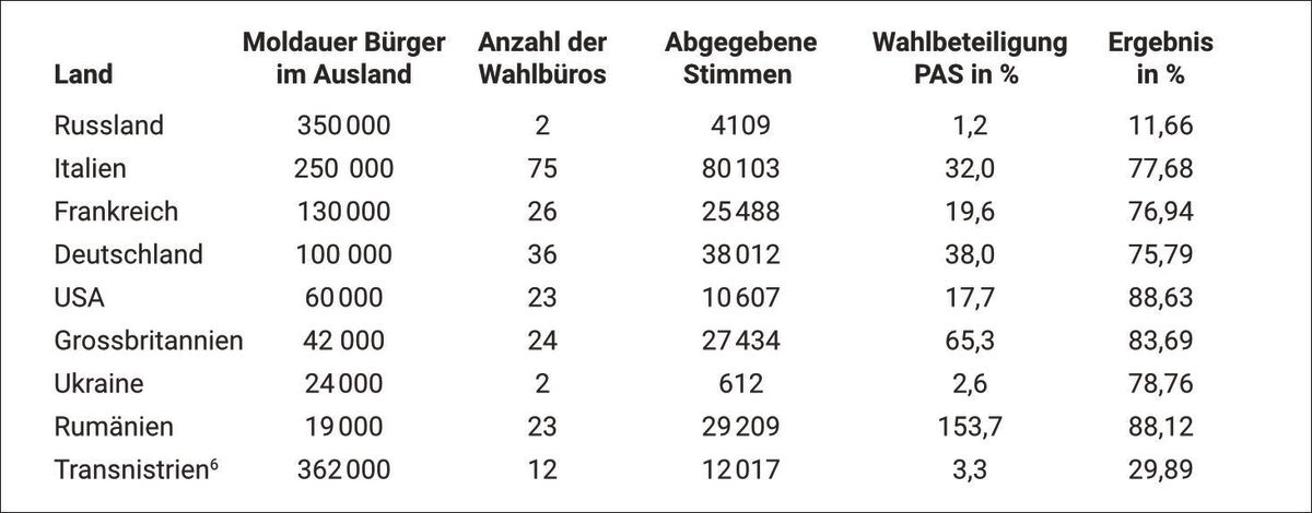 Innerhalb Moldaus gab es eine enorme Spreizung der Ergebnisse. Während die PAS in der Hauptstadt auf 58,62 Prozent der Stimmen kam, entschieden sich – wie bereits erwähnt – in Gagausien für sie lediglich 3,19 Prozent. Ausdruck eines zutiefst gespaltenen Landes.
