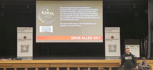 Dann folgen Schlag auf Schlag, verdeutlicht mit Bildern aus Werbung, Social Medias, dem Internet und rockiger Musik Informationen über das Nervengift Nikotin in Zigaretten, Vapes (elektronische Zigaretten) und Snus (Tabakbeutel/Nikotinbeutel).1 Nikotin ist ein starkes Nervengift. «1/4 Teelöffel kann einen Mann töten, ein achtlos weggeworfener Nikotinbeutel ein Kind!» Fast alle Süchtigen hätten Alkohol getrunken, bevor sie mit dem Konsum von Kokain begonnen hätten. Aber auch Alkohol sei ein starkes Nervengift, es greife alle Organe an. Viele hätten unter Alkohol ein erstes Mal Sex. Hier warnt er auch vor dem Konsum von Pornographie: eine natürliche Begegnung mit einem Menschen des anderen Geschlechts löse bei regelmässigem Pornographiekonsum dann kaum mehr Erregung aus, Impotenz sei das Resultat.Auch bezüglich Cannabis spricht Thomas Feurer eine deutliche Sprache: Kiffer teilen nicht nur den Stoff, sondern bei der Weitergabe von Joints auch Viren, Bakterien, Pilze, Parasiten… Zudem seien die meisten Psychosen junger Menschen in einer psychiatrischen Klinik durch Cannabis hervorgerufen. Keiner wisse zum Voraus, ob er anfällig sei für die Entwicklung einer Psychose durch Cannabiskonsum. Auch sei der Verlauf der Erkrankung nicht vorherzusagen – ob die Psychose bald wieder abklinge oder über lange Zeit bestehen bleibe.