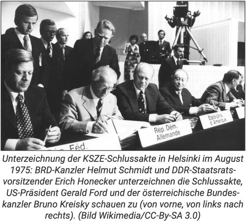Nach zweijährigen Verhandlungen, die vom 18. September 1973 bis zum 21. Juli 1975 in Genf stattfanden, unterschrieben am 1. August 1975 in Helsinki die Delegierten von 35 Staaten die KSZE-Schlussakte. Das Dokument ist in vier Abschnitte gegliedert. Der erste Abschnitt behandelt «Fragen der Sicherheit in Europa», gegliedert in eine Erklärung von zehn Leitprinzipien:
